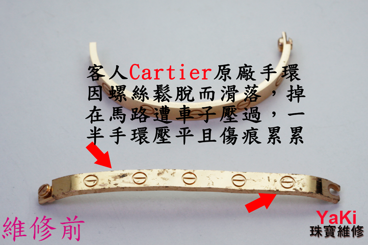 因客人Cartier玫瑰金18K金手環配戴過程不小心滑落掉在馬路上,經察覺手環不見,趕快回頭尋找,當找到時內心真的在淌血;因整個手環已被車子壓過而表面碰撞刮傷嚴重且手環金屬的螺絲不見而無法配戴;經由朋友介紹說YaKi珠寶維修師傅或許可以幫忙維修處理這只手環。當客人寄來維修手環,師傅看到也傻眼因為要維修回復原來模樣是非常有挑戰性且難度非常高,不易處理呀!但師傅也是接下這燙手山竽的挑戰。經YAKI珠寶師傅以經驗與技術,抽絲剝繭、逐一解決就完成客人難度很高手環維修後,客人Cartier玫瑰金18K金手環變成全新手環了。