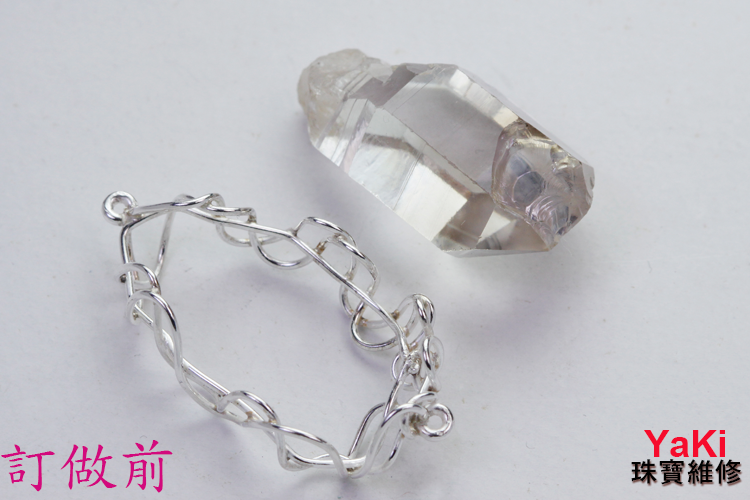 客人有一顆不規則形白色水晶因找不到適合金工師傅製作戒台,經網路搜尋找到YaKi客製化珠寶想請師傅製作花樣配件。因該水晶形狀有菱有角且形狀無規則性,對有經驗金工師傅來說真是考驗!經YAKI珠寶師傅與客人當面溝通想法和造型後,客人完全放心交給師傅來創作,師傅就以一線到底完成的方式來巧思編創手飾,經時間的歷練後,白色水晶就變成時尚不一樣配飾了。
