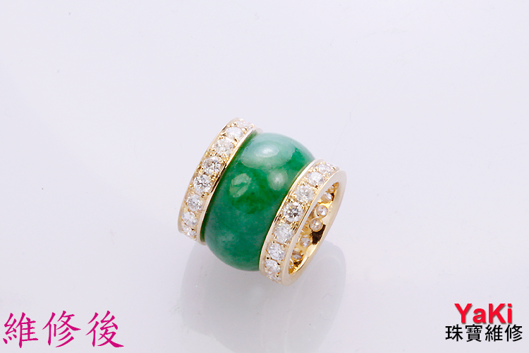 客人有一尊天然玉環要訂做墜子,因與YaKi珠寶師傅已熟識,經溝通後由師傅自己發揮創作製作簡約玉圈墜子。YAKI珠寶師傅經驗依客人所來玉圈形狀來打造墜型、弧度、鑲鑽、電鍍程序後;經YAKI珠寶師傅小心翼翼鑲崁就變成不一樣貼心玉圈墜子了。