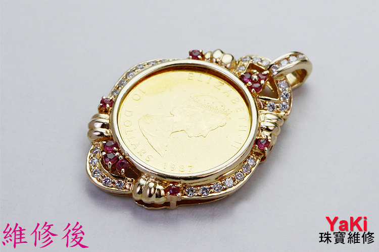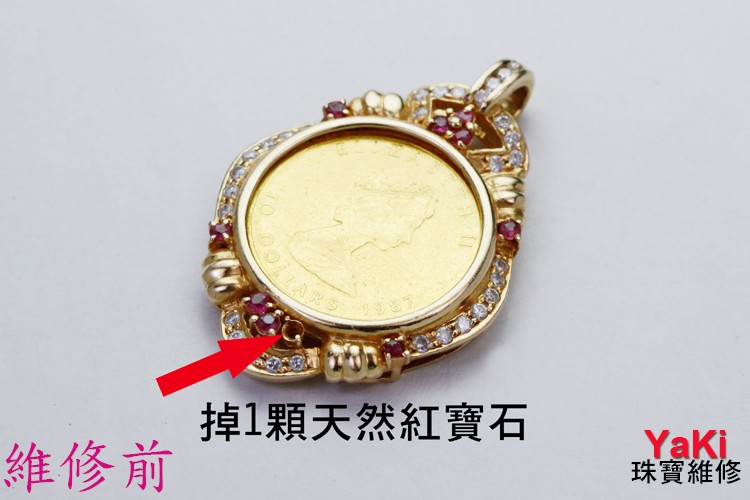 客人黃K金金幣墜子因長久配戴爪子疲乏而使紅寶石掉落不見,就請YaKi珠寶師傅幫忙補紅寶石。經YaKi珠寶師傅找一顆大小顏色符合座台的天然紅寶石把它補上後,並檢查其他寶石是否有晃動情況,維修完成就恢復墜子的完整性。
