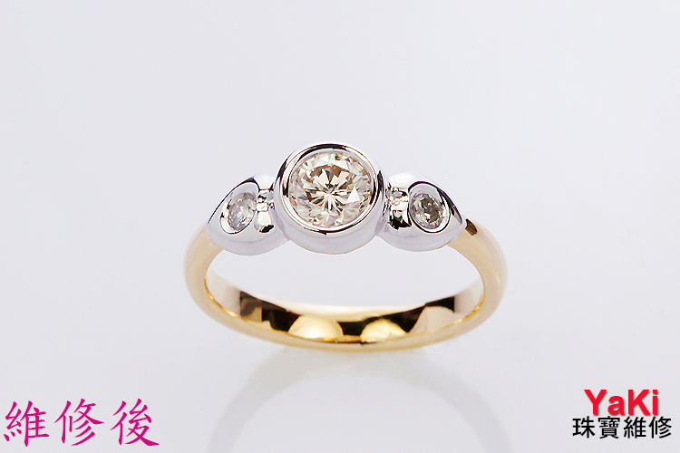 因客人K金戒指配戴過程有斷裂現象,要請師傅重新製作一模一樣戒指,就請YAKI珠寶師傅幫忙訂做。經YAKI珠寶師傅重新打造樣版、鑲鑽、分色電鍍程序後,把戒指變成全新"黃18K金"戒指。