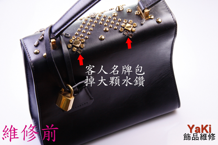 客人手提名牌包長期手提著而包包外觀有淺香檳色水鑽裝飾著,但有幾顆淺香檳色水鑽有脫離現象;客人經網路找到YaKi飾品維修,看我們是否有相同顏色大小水鑽修補,經彼此溝通客人同意可以等待後,YaKi師傅跟國外下訂相同顏色大小水鑽來維修。經一段時日水鑽寄來台灣也藉由師傅巧手修補完成後,手提名牌包外觀整體就保持完整性。