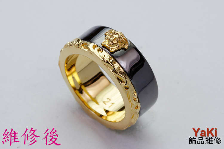 客人凡賽斯Versace品牌雙色戒指配戴過程表面刮傷退色使得戒指不美觀;客人就去原來購買的101櫃位請服務人員維修處理,因櫃位服務人員也沒有在做這樣的維修服務;後來櫃位人員經網路詢問我們可以處理該凡賽斯Versace品牌雙色戒指電鍍的問題,她真的很高興。於是櫃位人員親自拿來公司請師傅處理,師傅並告知處理的方式後,經YAKI維修師傅以經驗並用心地將雙色戒指以拋光電鍍維修後,雙色戒指就恢復原來美麗樣貌就可安心配戴了。