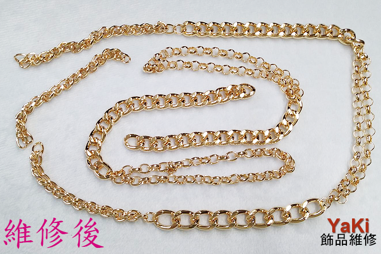 因客人皮革外套上項鍊配件因戴久了整個鍊子氧化退色,變得不美觀。於是客人在從網路上詢問並問過很多維修師傅,都說無法維修;客人不放棄繼續尋找一定可以幫他處理的維修師傅。經千辛萬苦網路搜尋終於找到YaKi飾品維修,並來電詢問是否我們有能力可以處理該斷裂手鍊,答案是我們可以處理的。客人來公司與維修師傅現場溝通後,師傅告知皮革外套鍊子要電鍍一定要將鍊子拆下,否則無法電鍍。經YAKI維修師傅以經驗並用心細心拋光電鍍維修後,整組項鍊都恢復如新,客人就可以將鍊子縫回衣服了。