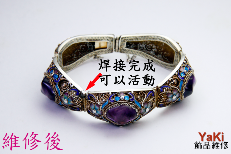 客人觀看國外網站因喜歡該華麗特別銀飾手鍊就跟國外網站下訂單購買,但哪知道寄到台灣配送到客人手上手鍊竟然分離斷裂使得客人難過無法配戴;於是客人在從網路上詢問並問過很多維修師傅及經驗豐富的師傅,都說無法維修;客人不放棄繼續尋找一定可以幫他處理的維修師傅,因他非常喜愛該手鍊。經千辛萬苦網路搜尋終於找到YaKi飾品維修,並來電詢問是否我們有能力可以處理該斷裂手鍊,答案是我們可以處理的。客人來公司與維修師傅現場溝通後,師傅點出手鍊原本損壞的問題所在,而師傅在維修過程會再加強整個結構性補強使它不再容易損壞斷裂。經YAKI維修師傅以經驗並用心細心維修後,銀飾手鍊焊接完成就恢復完整性且可活動自如,客人可安心配戴了。