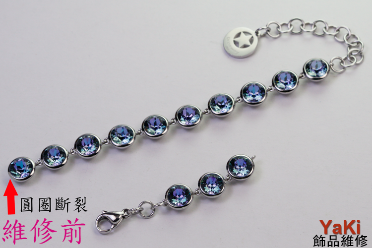 因客人不銹鋼手鍊配戴過程不小心扯斷掉一個圓圈,經FB網路找到YaKi飾品維修,問看看不銹鋼手鍊是否可以維修嗎!?因手鍊斷裂的旁邊有大顆藍色水晶在那裏,不能直接火燒,會把藍色水晶燒毀掉;經YaKi飾品師傅以經驗技術維修後,手鍊就恢復完整性,客人可安心配戴了。